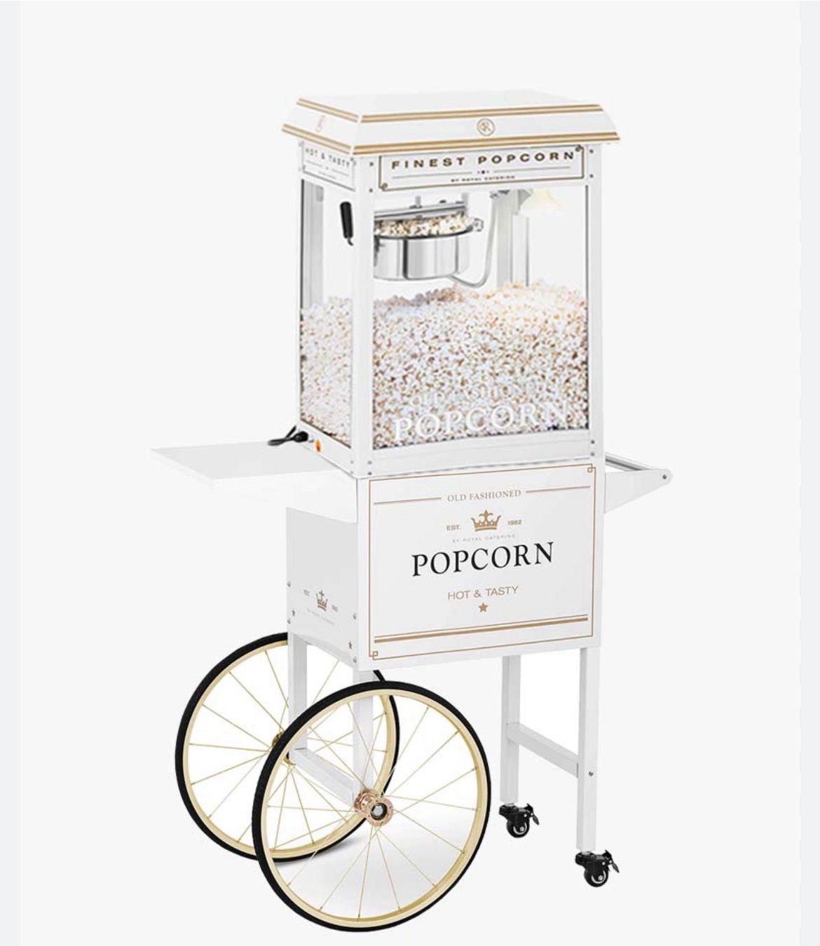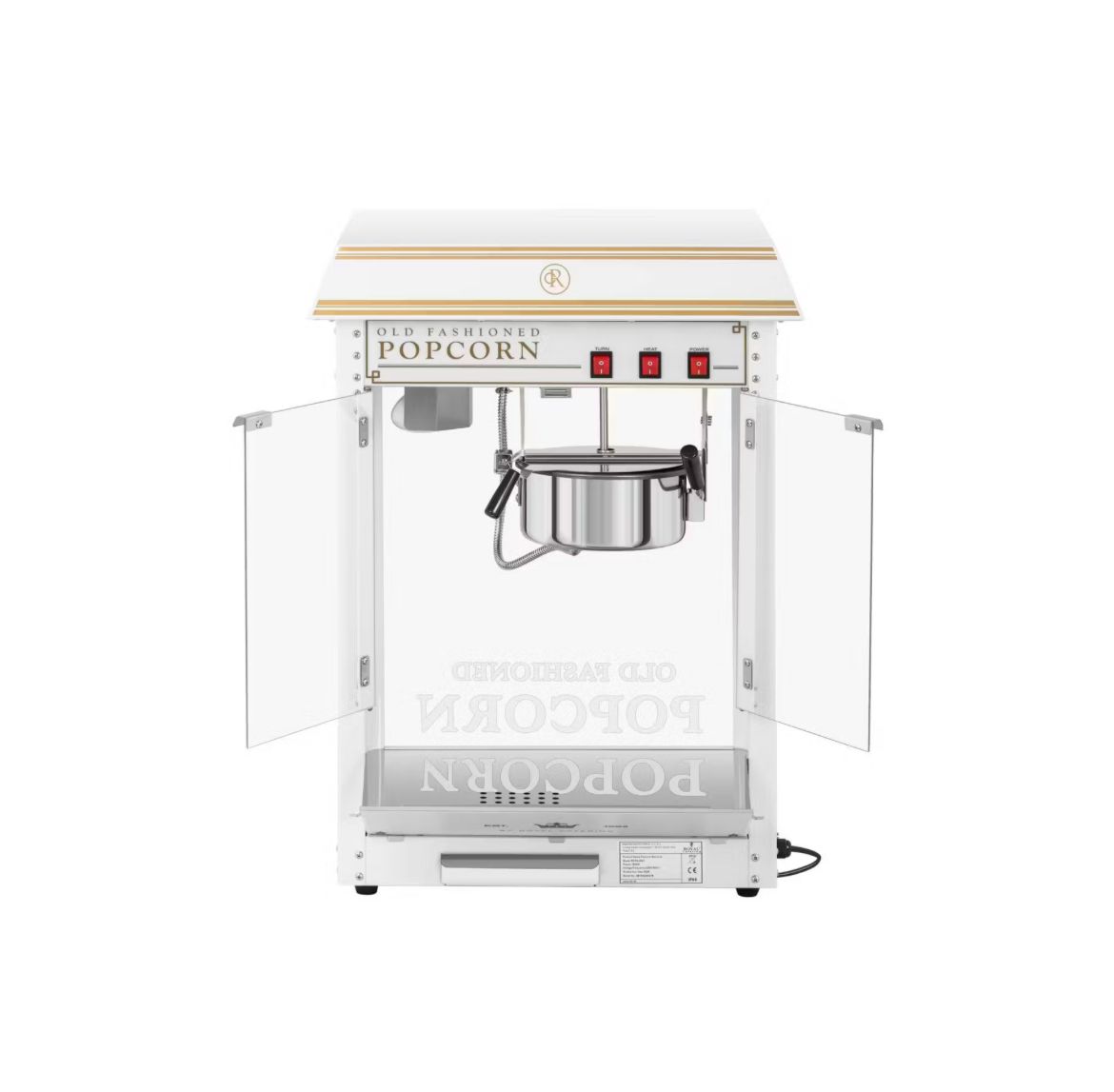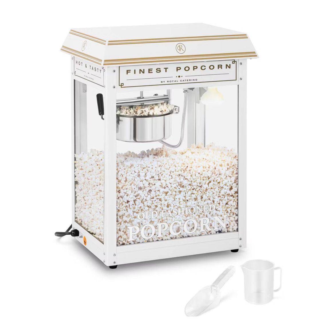 Die Popcornmaschine aus dem Hause Royal Catering wurde extra für den professionellen Gastronomiebedarf entworfen und ist ein absoluter Hingucker. Sie besticht nicht nur durch das ansprechend weiß-golden emaillierte Gehäuse, sondern auch durch eine beheizte sowie beleuchtete Kammer, ein Rührsystem und ein automatisches Thermostat. Profitiert vom Popcornmaker und lasst euch von einem außergewöhnlichen Popcornerlebnis überzeugen – ob nun im Kino, auf Jahrmärkten, Festivals, Hochzeiten usw.